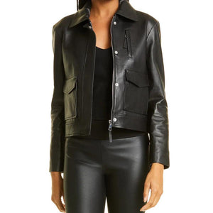 Verleihen Sie Ihrem Tages- (oder Abend-)Outfit eine Prise Eleganz mit dieser butterweichen Lederjacke mit geräumigen Taschen und verkürzter Länge.