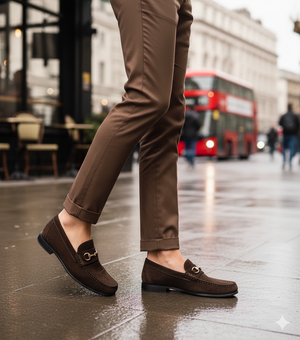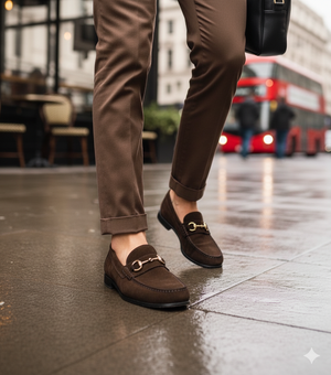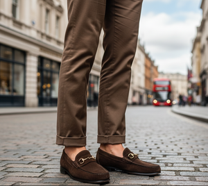 Elegante braune Wildleder-Loafer mit Horsebit . Diese Loafer aus hochwertigem Wildleder bieten eine raffinierte Mischung aus zeitlosem Stil und modernem Komfort. Das goldfarbene Horsebit-Detail verleiht einen Hauch von Luxus und macht sie perfekt für elegante und formelle Anlässe. Mit ihrer strapazierfähigen Ledersohle und der gepolsterten Innensohle bieten diese Loafer ganztägigen Komfort und raffinierte Eleganz. Hochwertige Schuhspanner aus Zedernholz sorgen für Formbeständigkeit und Langlebigkeit.