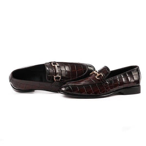 Erleben Sie zeitlose Eleganz mit diesen burgunderfarbenen Loafern mit Krokodilprägung von Harmain Leathers. Diese Slipper wurden für den modernen Gentleman entworfen und strahlen Luxus und Eleganz aus. Das tiefe Burgunderrot, gepaart mit einem goldfarbenen Metalldetail, setzt ein markantes und stilvolles Statement für jeden formellen oder halbformellen Anlass.
