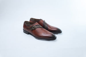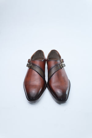 Signature Style: Sleek double monk strap design with adjustable brass-finished buckles.