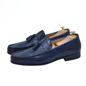 Erweitern Sie Ihre Schuhkollektion mit diesen handgefertigten marineblauen Loafern mit Krokoprägung und Quasten , entworfen für den modernen Gentleman im Vereinigten Königreich. Mit ihrem hochwertigen Krokoprägungsleder und den klassischen Quastendetails sind diese Loafer der Inbegriff von Eleganz und Vielseitigkeit.