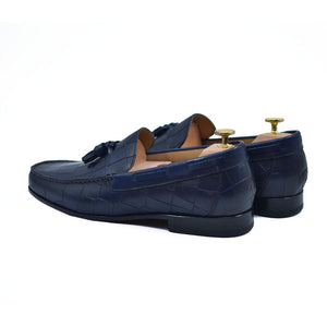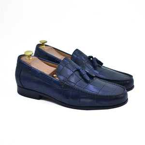 Harmain Leathers – Marineblaue Loafer aus Leder mit Krokodilprägung und Quasten