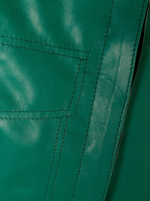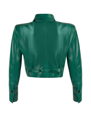 Eine Lederjacke mit einer starken Silhouette basierend auf scharfen Schultern und einer verkürzten Länge, die über gepolsterte Schultern, einen Einknopfverschluss, zwei Brusttaschen und einen verstellbaren Verschluss auf der Rückseite verfügt.