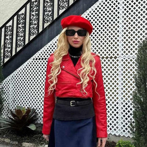 Verleihen Sie Ihrer Garderobe mit dieser leuchtend roten Leder-Bikerjacke einen auffälligen, modischen Touch. Diese Jacke für stilbewusste Frauen vereint klassische Biker-Ästhetik mit einem schicken, modernen Touch. Hochwertiges Leder sorgt für Langlebigkeit und Komfort und ist die perfekte Oberbekleidung für jede Jahreszeit.