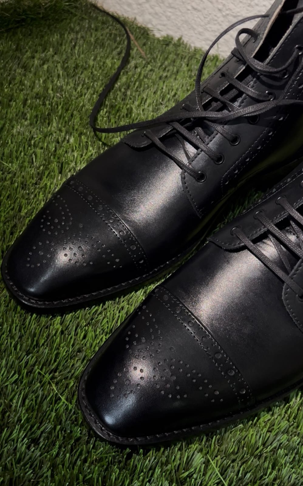 - Design: Classic wingtip brogue with lace-up ankle height.