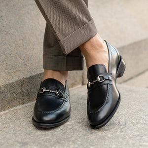 Refine your style with our black leather horsebit loafers, a staple for the modern gentleman. Crafted from premium full-grain leather, these shoes offer a sleek silhouette, silver-tone horsebit detail, and a hand-stitched finish, making them perfect for both formal and smart-casual wear. Designed for comfort and durability, these loafers feature a cushioned leather insole and a sturdy leather sole for long-lasting wear.